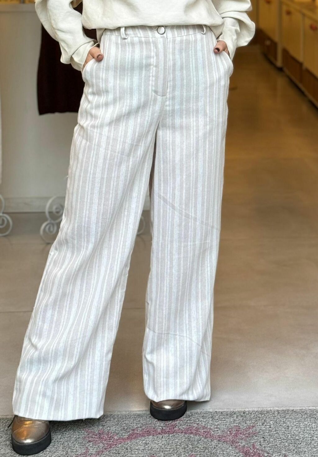 Calça pantalona, em listras nos tons claros, bolsos, e um caimento lindo!