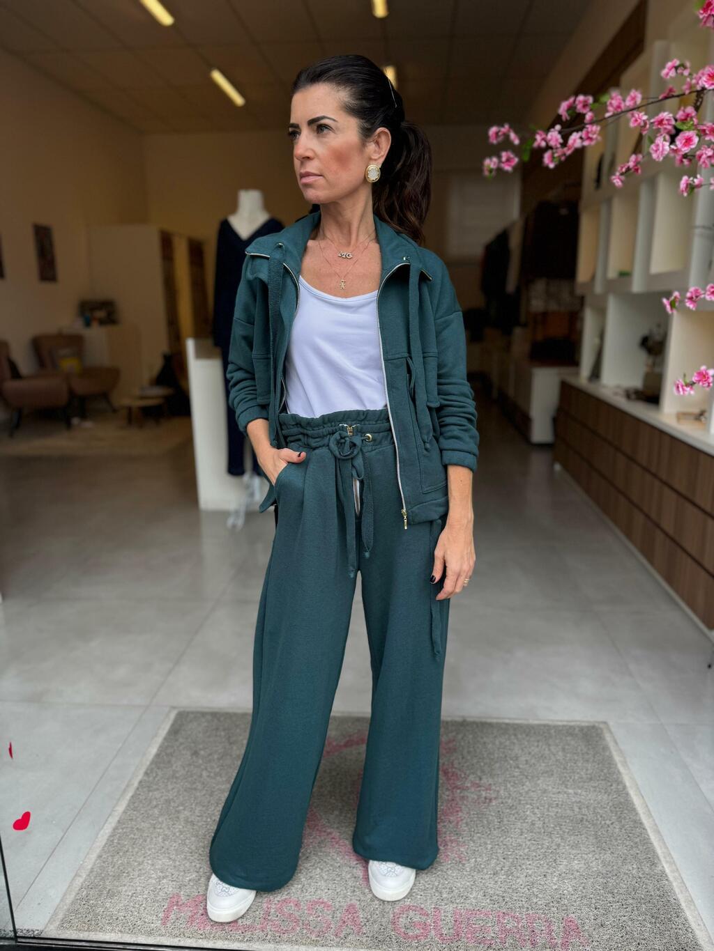 A jaqueta, com gola, bolsos e zíper, oferece praticidade e um toque moderno, enquanto a calça pantalona com elástico, bolsos e zíper garante caimento fluido e conforto absoluto. Uma peça versátil para o dia a dia, perfeita para compor looks casuais sem abrir mão da elegância.
