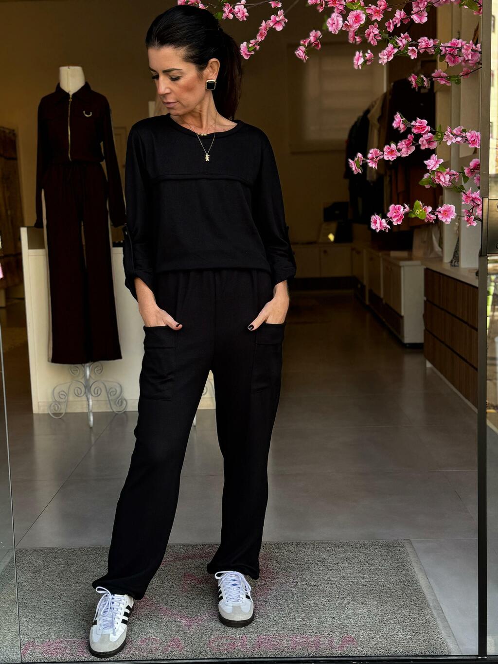 Elegância atemporal em cada detalhe! Este conjunto todo em tricot na cor preta une estilo e conforto de forma impecável. A blusa de mangas longas garante um caimento sofisticado, enquanto a calça com bolsos e elásticos traz praticidade e modernidade. Um look versátil que transita do casual ao chic com facilidade, perfeito para compor produções cheias de personalidade.