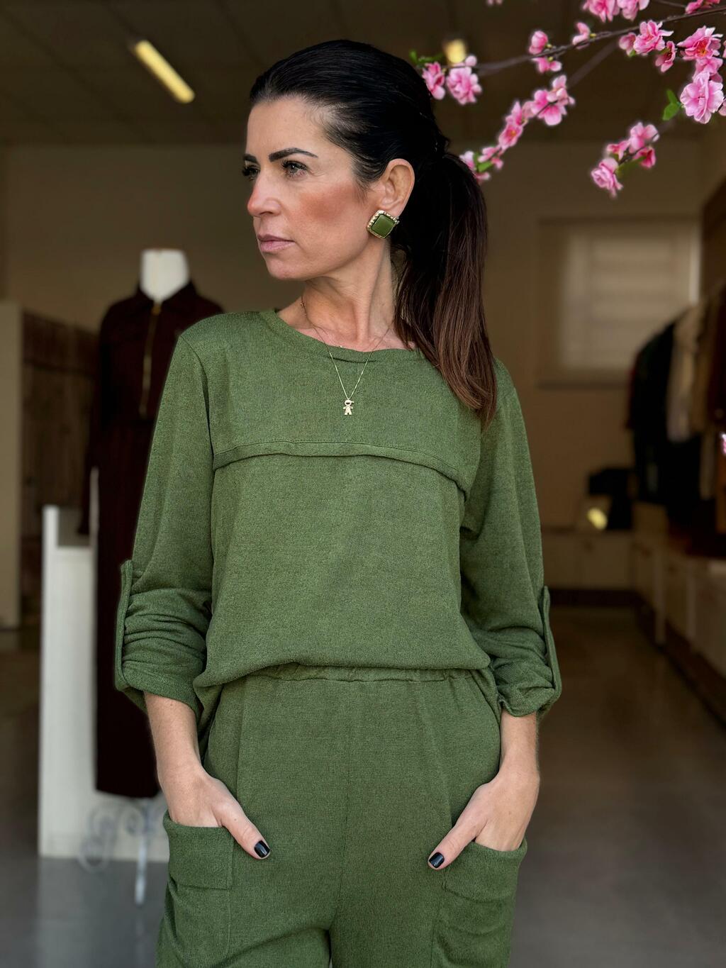 Elegância e conforto se encontram neste conjunto todo em tricot. A blusa de mangas longas garante aconchego, enquanto a calça com bolsos e elásticos oferece praticidade e caimento perfeito. Na cor verde militar, a peça é versátil e moderna, perfeita para criar looks casuais ou sofisticados com muito estilo e personalidade.