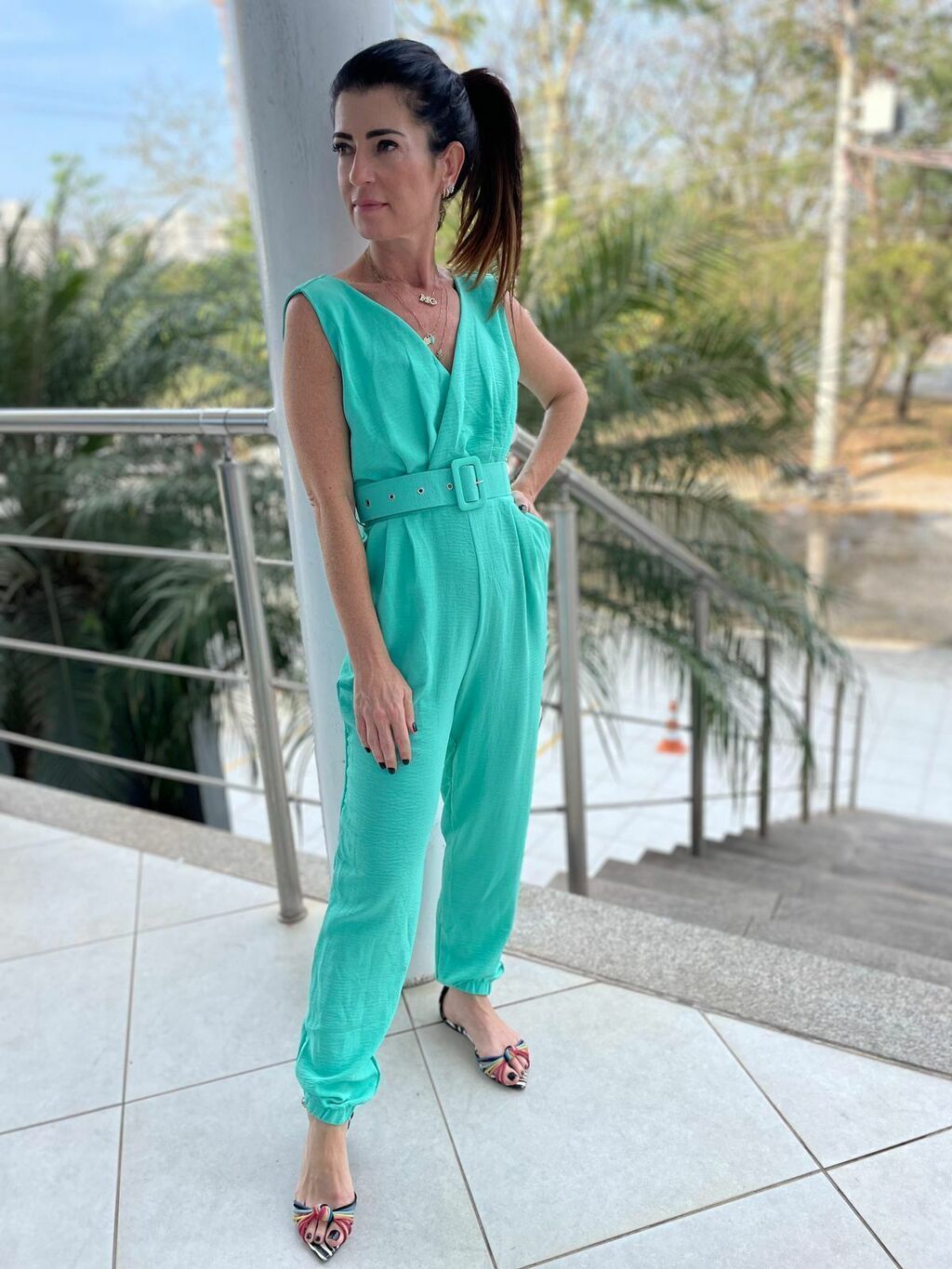Macacão em crepe, longo, bolsos e cinto forrado no mesmo tecido!