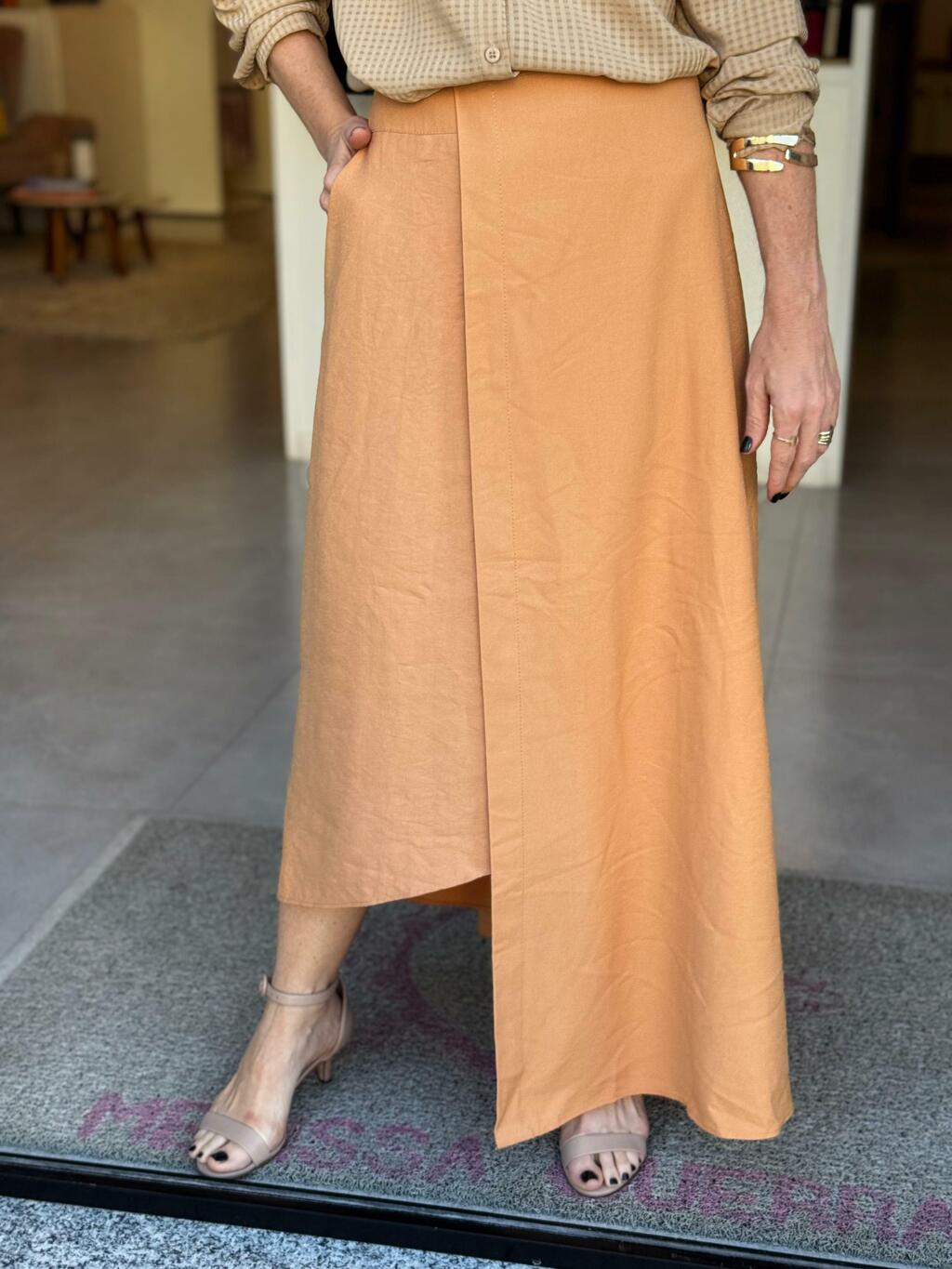 Um toque moderno e sofisticado em cada detalhe essa saia assimétrica na cor pêssego é pura elegância com leveza.