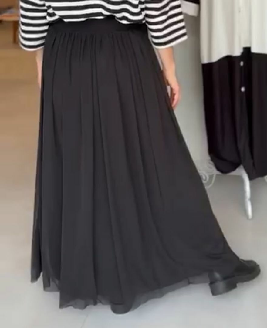 Suas camadas criam um efeito fluido e sofisticado, enquanto o elástico na cintura garante conforto e caimento impecável.