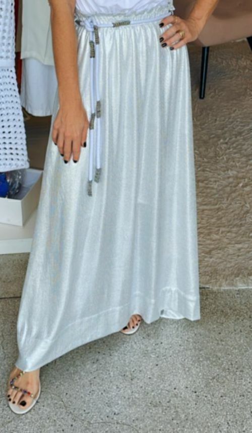 A saia longa metalizada é daquelas peças que não passam despercebidas elegante, fluida e com um toque moderno.